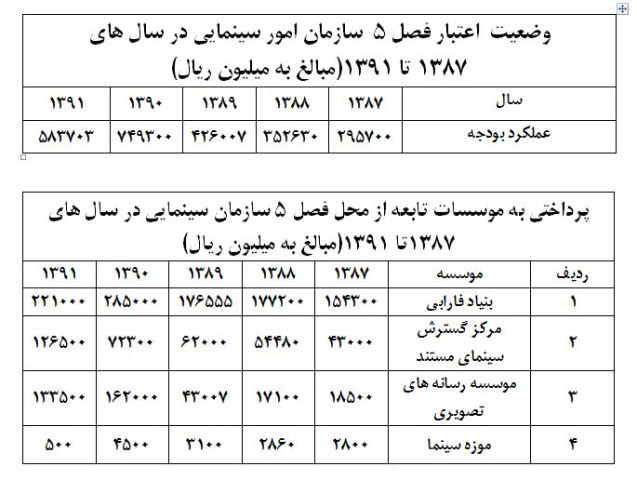فهرست اعلام شده رقم بودجه سازمان سینمایی و لیست پرداختی های سازمان طی سالهای ۱۳۸۷ تا ۱۳۹۱ به بنیاد سینمایی فارابی، مرکز گسترش سینمای مستند و تجربی ، موسسه رسانه های تصویری و موزه سینما است.