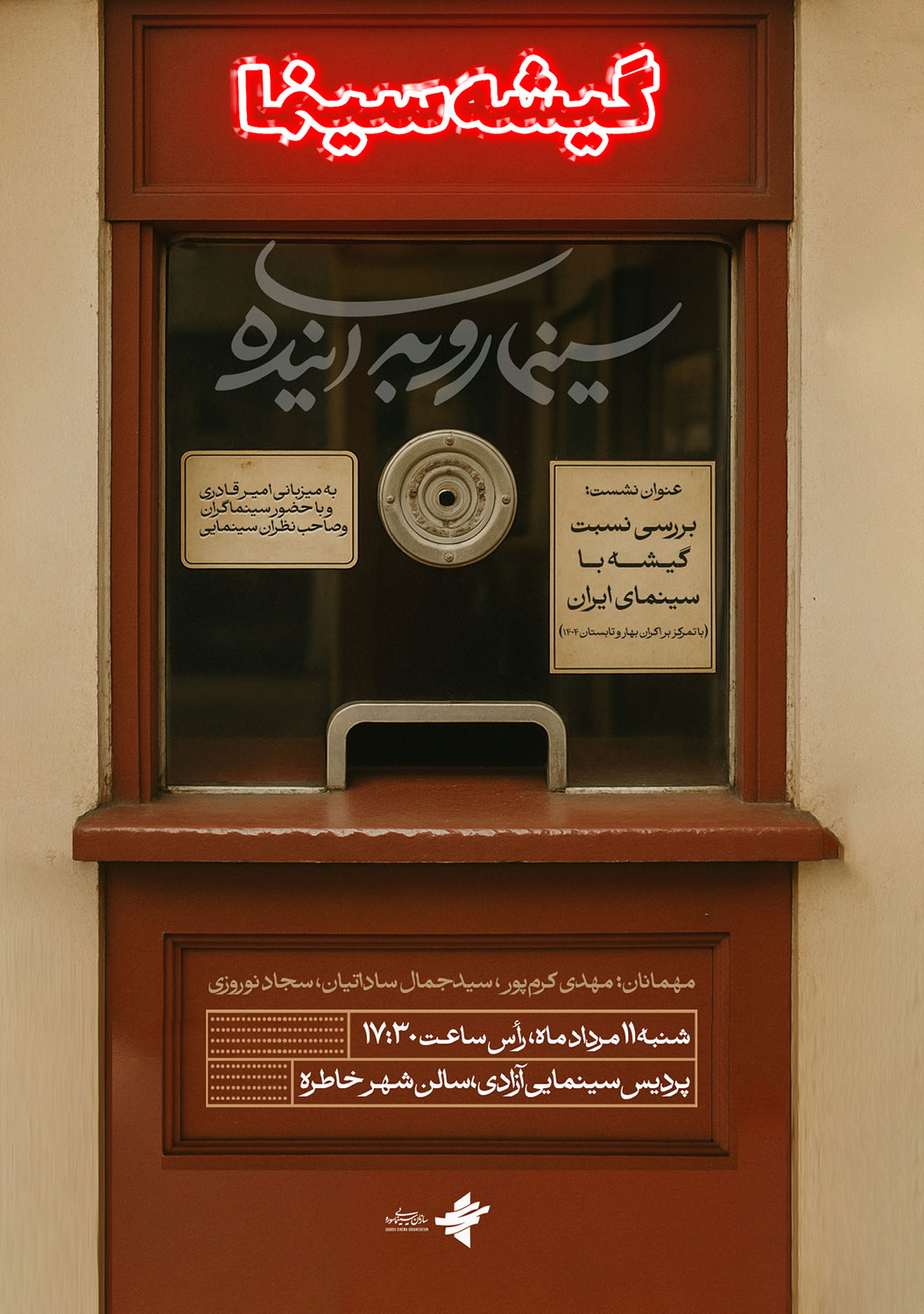به گزارش سوره سینما به نقل از روابط عمومی سازمان سینمایی سوره، دور جدید سلسله نشستهای «سینما رو به آینده» که توسط سازمان سینمایی سوره به میزبانی امیر قادری و با حضور صاحبنظران سینمایی برگزار میشود، به نهمین جلسه خود رسیده است و شنبه ۱۱ مردادماه با هدف بررسی نسبت گیشه با سینمای ایران برگزار میشود.