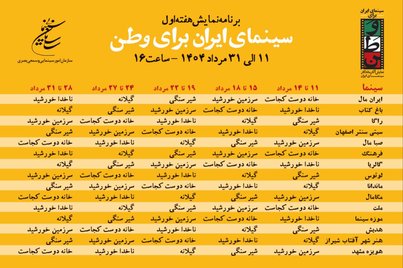 هفته اول برنامه «سینمای ایران برای وطن» که از ۴ مرداد با نمایش و نشست های هر فیلم در موزه سینما آغاز شد به فیلم های «خانه دوست کجاست» ساخته عباس کیارستمی، «سرزمین خورشید» ساخته احمد رضا درویش، «شیر سنگی» ساخته مسعود جعفری جوزانی، «گیلانه» ساخته رخشان بنی اعتماد و محسن عبدالوهاب و «ناخدا خورشید» ساخته ناصر تقوایی اختصاص دارد.