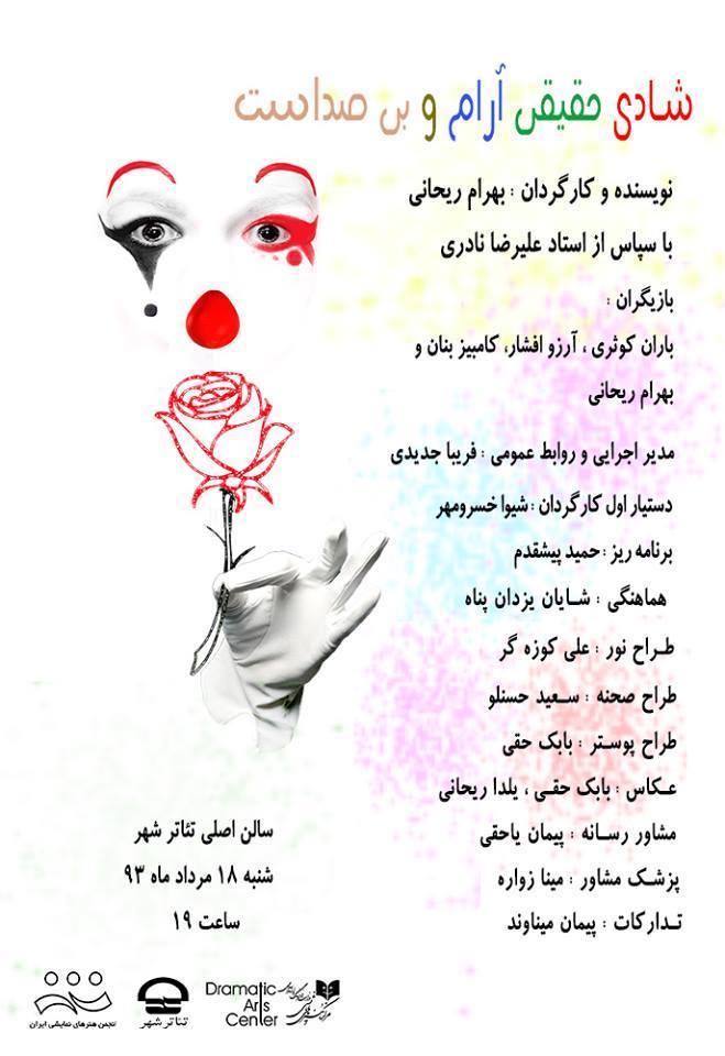 نمایش «شادی حقیقی آرام و بیصداست» به کارگردانی بهرام ریحانی است و باران کوثری، آرزو افشار ، کامبیز بنان و بهرام ریحانی در آن بازی میکنند. این مراسم ساعت ۱۸ شروع می شود و نمایش ساعت ۱۹ در سالن اصلی اجرا می شود.