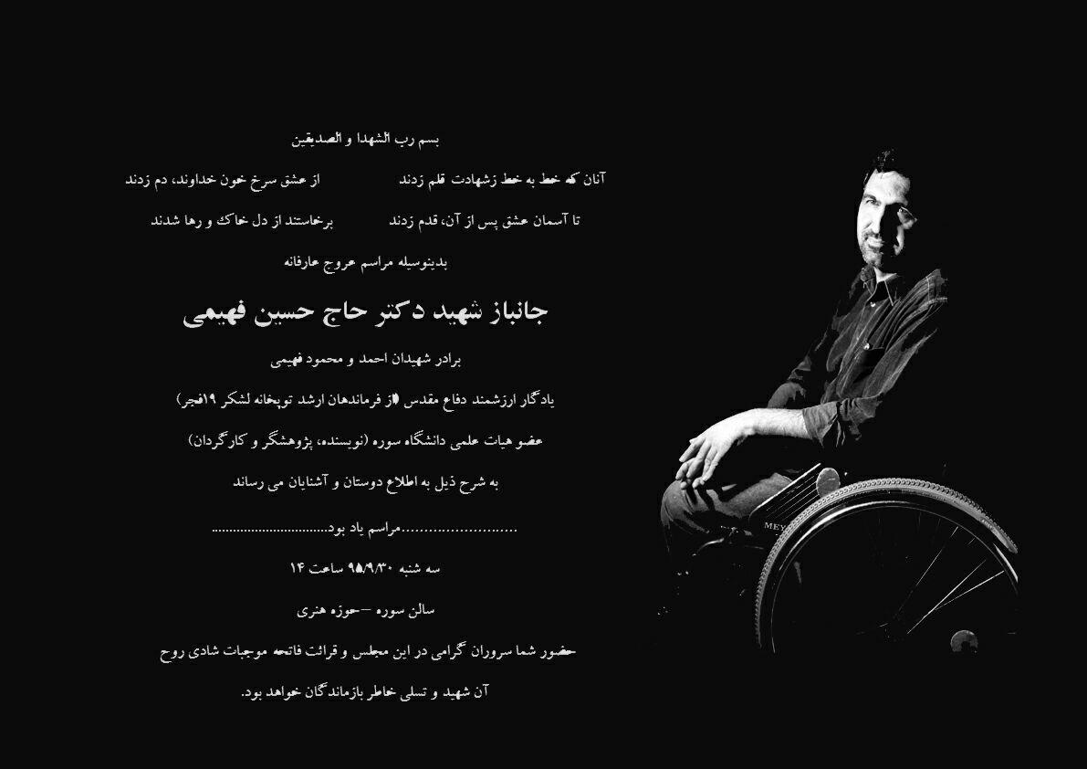 به گزارش سوره سینما مراسم یادبود شهید دکتر حسین فهیمی فیلمساز، پژوهشگر و یادگار ارزشمند دفاع مقدس و عضو هیات علمی دانشگاه سوره سه شنبه ۳۰ آذر ساعت ۱۴ در سالن سوره حوزه هنری برگزار میشود.